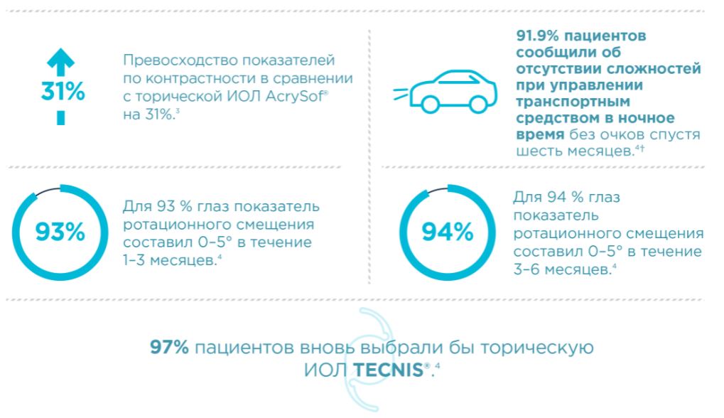 ПРЕДУПРЕЖДЕНИЯ: Ротационное смещение торических ИОЛ TECNIS® от рассчитанной оси может привести к значительному уменьшению астигматической коррекции. Отклонение от оси более чем на 30° может привести к существенному снижению остроты зрения пациента.